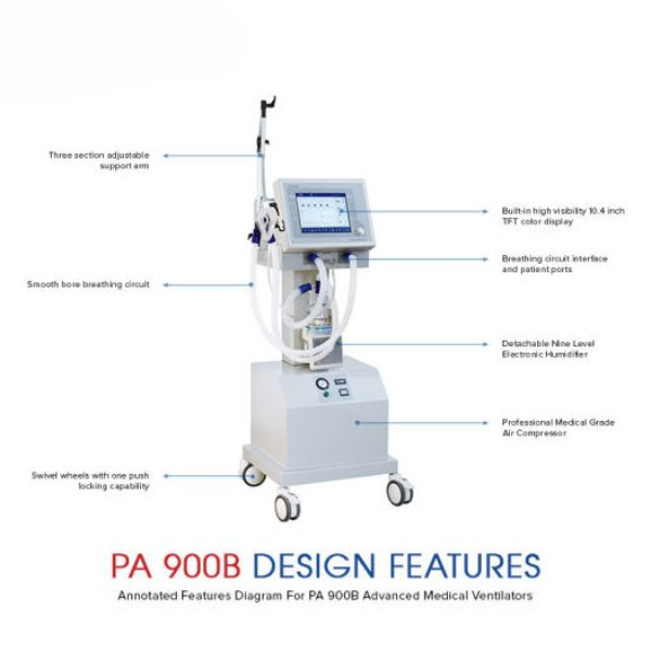 Máy thở PA900B là dòng sản phẩm đang được rất nhiều cơ sở y tế, bệnh viện lựa chọn sử dụng để hồi sức cấp cứu lâm sàng và điều trị hô hấp do các vấn đề sức khoẻ gây ra. Sản phẩm được thiết kế trang nhã, thân thiện với môi trường, dễ vận hành và đưa vào sử dụng. Đồng thời cũng được tích hợp nhiều tính năng ưu việt nhằm cải thiện chất lượng khám chữa bệnh của bệnh viện, phòng khám, phòng ICU…